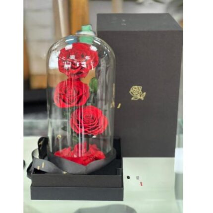 Large single red rose in vase box a beautiful and calm, but willing to draw blood in it’s defense