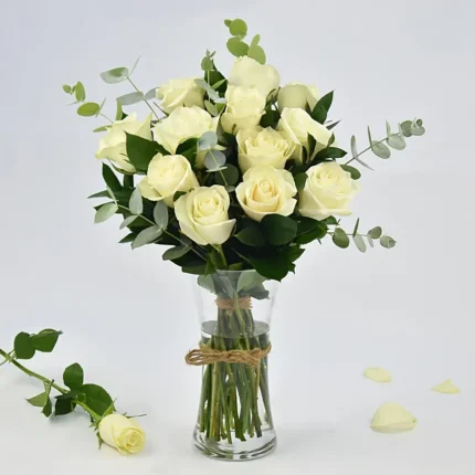 12 White Roses 5 Stems Single Ruscus 2 Stems Eucalyptus Berry Arranged in a Cylindrical Glass Vase