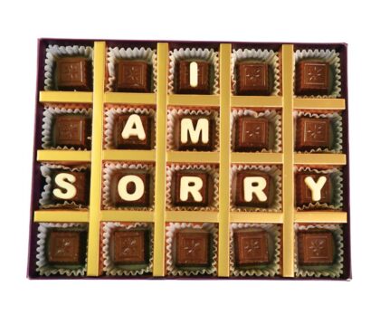 Your Gift Contains: – 20 pieces assorted Milk chocolate with I Am Sorry Message – Flavors: Pistachio Praline, Rice Crispy,
