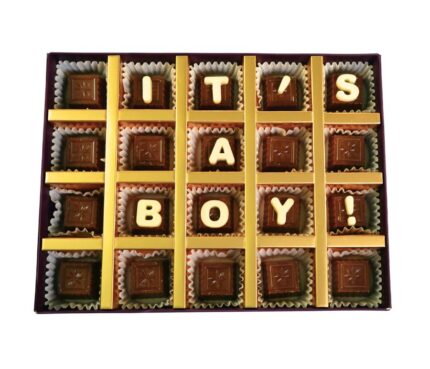 Your Gift Contains: – 20 pieces assorted Milk chocolate with It’s A Boy Message – Flavors: Pistachio Praline, Rice Crispy,