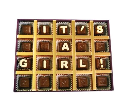 Your Gift Contains: – 20 pieces assorted Milk chocolate with It’s A Girl Message – Flavors: Pistachio Praline, Rice Crispy,