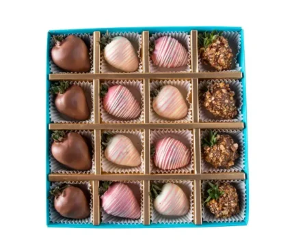16 pieces of assorted strawberries covered with milk, white and rosé chocolate and sprinkled with nuts. Handling and Storage: Keep