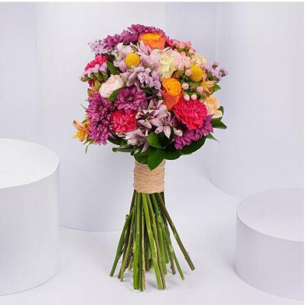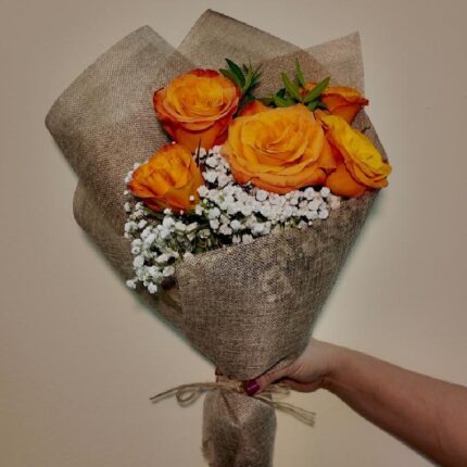 5 Red Rose 5 Orange Rose 5 Light Pink Rose 5 Yellow Rose Green Ruscus Beautifully Tied with tread