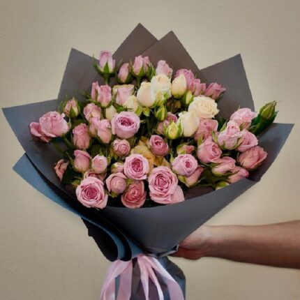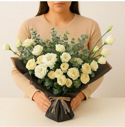 5 White Lisianthus 6 Peach Spray Roses 4 Stems of Eucalyptus Beautifully Wrapped