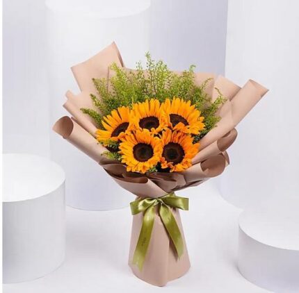 5 Sun Flower 2 dry leaves ruscus 5 ruscus yellow 2 soliduster oasis base 6 pc black wrapping