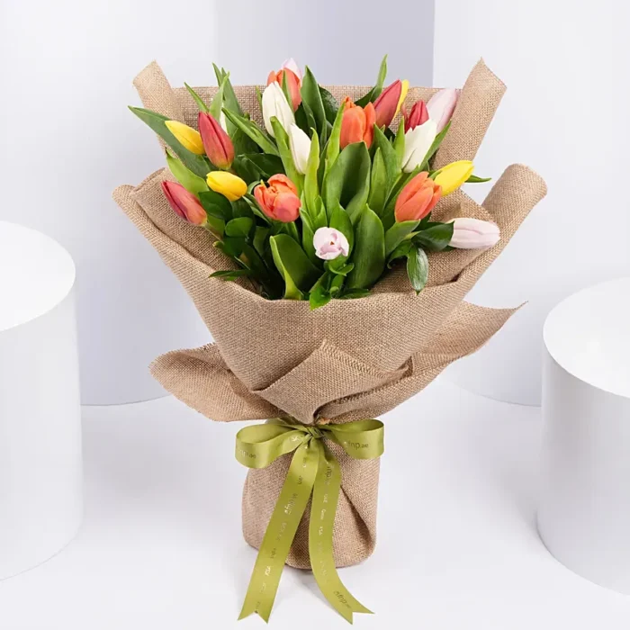 5 Cappucino Rose 10 Vandella White Rose 4 White Astilbe 2 Cinerea Eucalyptus 1 Brown Bori Beautifully Wrapped and tied