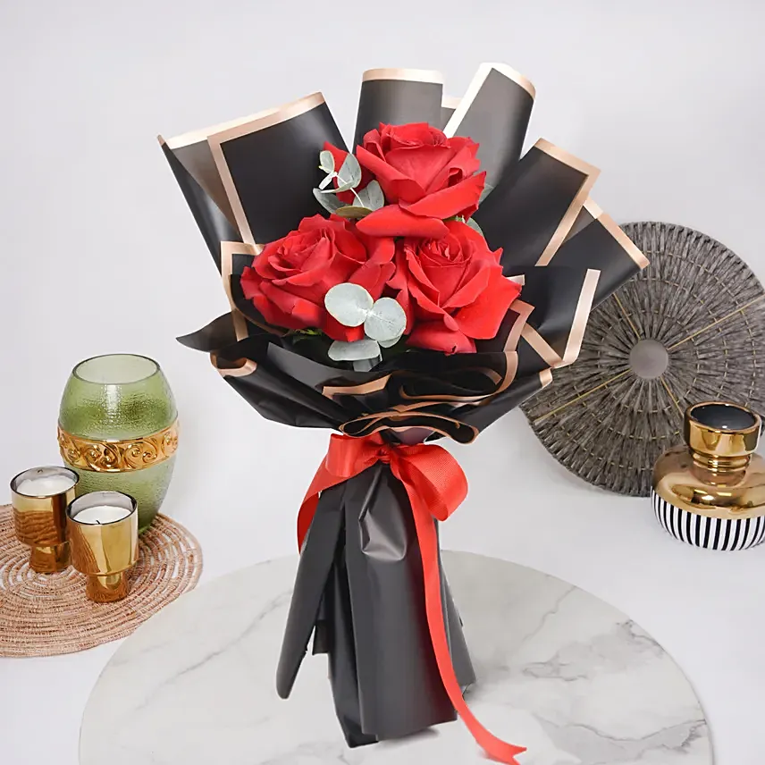 4 Dark Pink Roses 4 Red Spray Rose purple wax filler 2 Pink Lemonium 5 Ruscus 1 Teddy 10 Diary