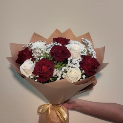 5 White Rose 5 Ever Red Rose 2Pistacia 2 Gypso 4pcs Brown Paper Gold Satin H 45 W 40