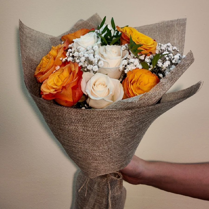 A cheerful mix of orange roses and yellow carnations, with touches of lepidium dragon for texture — wrapped in white