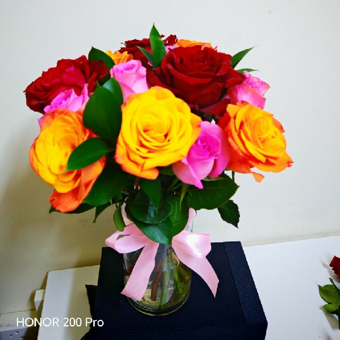 5 Orange Rose, 5 Revival Pink, 3 Ever Red Rose, 4 Ruscus