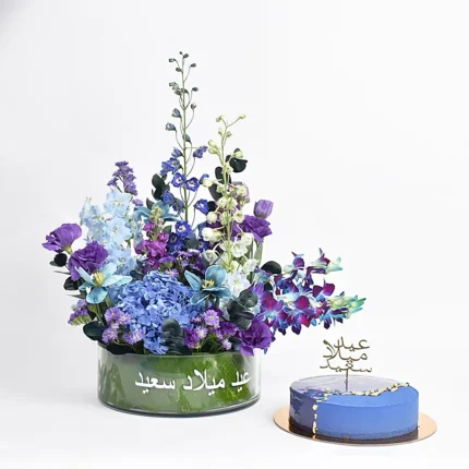 Birthday Cheers For Him and Cake 1 Light Blue Delphinium Flower 1 Dark Blue Delphinium Flower 3 Blue Orchid Dendrobium