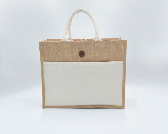 Natural Laminated Jute Bag, featured with a canvas pocket, Velcro & button closure, crafted from high-quality jute material (13×13 weave) for durability and sustainability. Featuring soft padded handles for comfortable carrying, this eco-friendly jute bag is both practical and reusable.