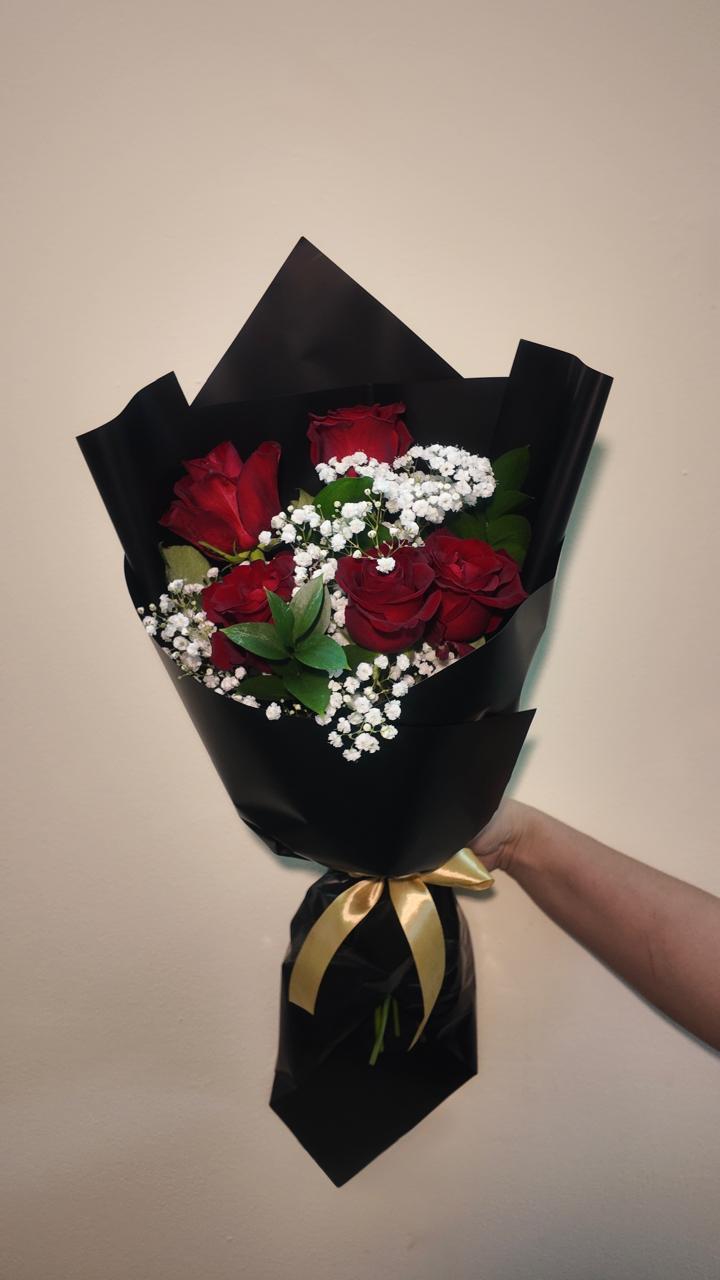 5 Rose Ever Red 3 Ruscus 1Gypso 3pcs Black Paper Gold Satin H 40 W 35