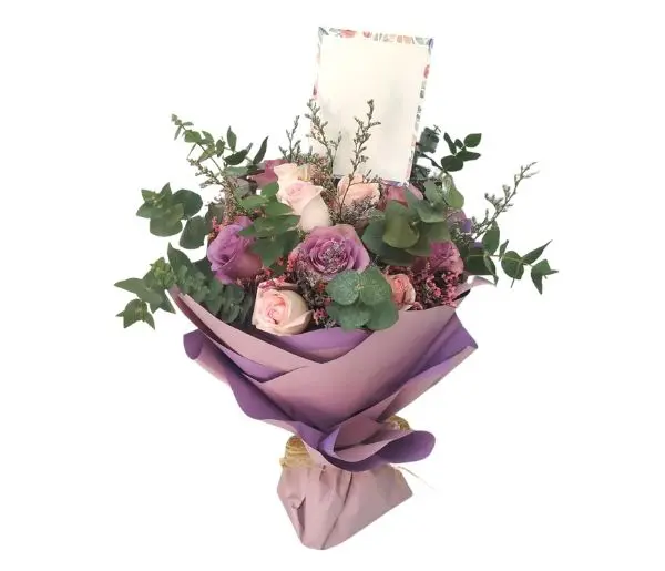 A hand held bouquet of purple, light pink and peach roses mixed with eucalyptus leaves and limonium wrapped in kraft paper.