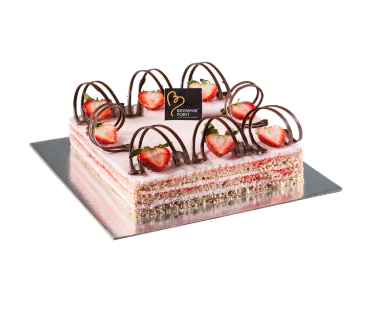 A refreshingly juicy combination of moist strawberry sponge interlayered with creamy strawberry mousse and fresh strawberries