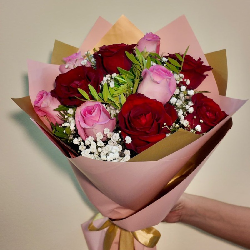 Brighten someones day with the Delightful Pink Bunch, a stunning arrangement of 10 elegant pink roses, 12 soft pink carnations,